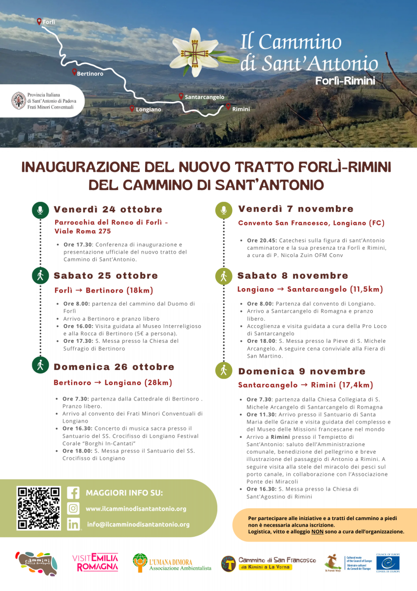 • Venerdì 24 ottobre a Forlì ore 17.30 alla Parrocchia del Ronco di Forlì - Presentazione dell’intero nuovo tratto romagnolo Forlì, Bertinoro e Longiano, con interventi della Diocesi di Forlì-Bertinoro, di padre Roberto Brandinelli, ministro provinciale dei Frati Minori Conventuali del Nord Italia, dell’Associazione Cammino di San Francesco Rimini – La Verna APS e dell’associazione l’Umana Dimora.