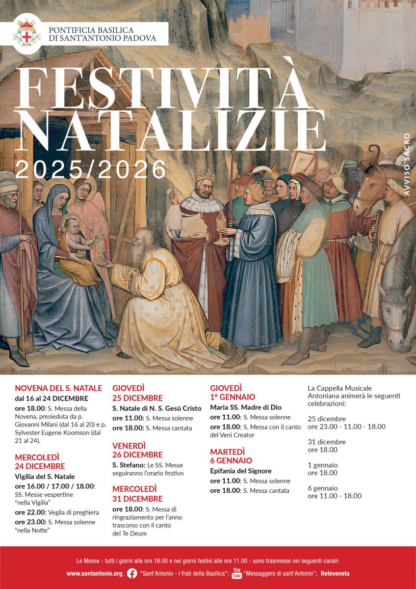 - ore 23.00: S. Messa solenne "nella Notte" presieduta dal rettore della basilica, padre Antonio Ramina, e animata dalla Cappella Musicale Antoniana (la messa viene trasmessa in diretta televisiva, streaming web e social*).